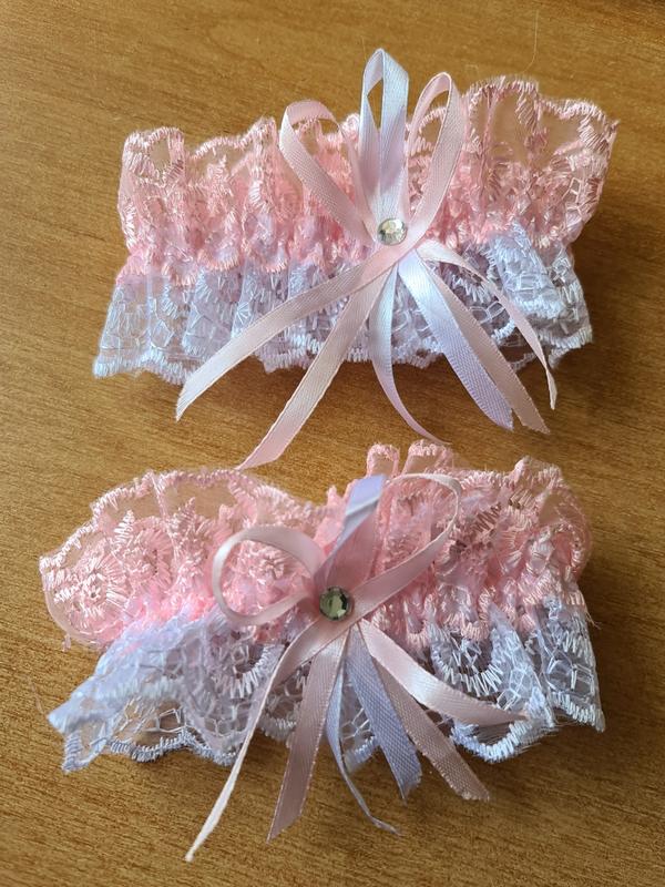 Пара ніжних весільних підвязок біло-рожевого кольору, нові, не одягнуті, в упаковці, ажурні шириною 8 см, всередині резиночка, тягнеться від 12 см до 24 см в ширину. Підійдуть як для нареченої, так і для романтичних зустрічей, продаються парою за 150 грн