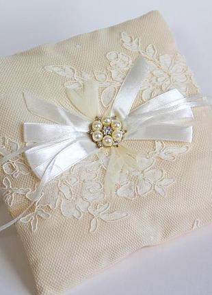 Подушка для колец - декор атласной лентой, кружевом, брошью и бусинками-жемчужинками. Размер подушечек - 18х18см На обратной стороне ленточка для руки, что позволяет удобно держать подушечку Обручальные кольца одеваются на ленточку