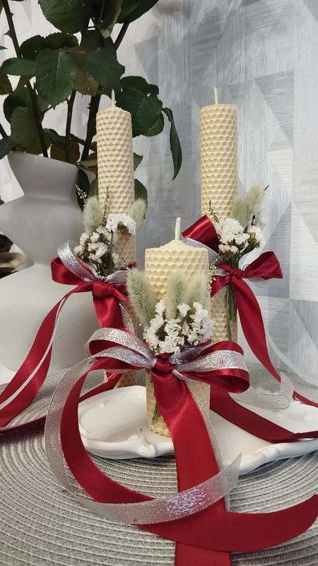 Набор свадебных свечей для обряда "Семейный очаг" Три свечи + гипсовая подставка. Свечи из натуральной вощи с декором сухоцветов.