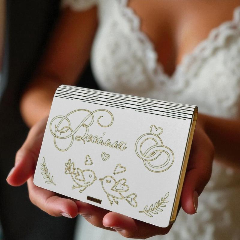 Свадебная Подставка "Весілля" для Свадебных Обручальных Колец Размер: 14 х 11 х 2 см. Материал: ЛДВП. Деревянные подставки для обручальных колец незаменимый аксессуар во время свадебной церемонии, они будут прекрасно смотреться на свадебных фотографиях и в руках молодоженов во время торжественного обмена кольцами! В ассортименте есть круглые подставки под обручальные кольца с буквами именами и датой свадьбы, свадебные коробочки для обручалок со стеклом и инициалами молодоженов, коробочки для колечек с гравировкой имен и даты, деревянные коробочки для кольца для предложение свадьбы, коробочка на предложение руки и сердца - выходи за меня свадебная церемония обмен обручальными кольцами невеста и жених, футляр для обручального кольца для невесты, подставки для обручалок в форме сердца, в виде сердечка на свадьбу. Срок изготовления оптовых заказов: 1-3 дня. Наличие необходимого цвета/модели уточняйте до оформления заказа! Возможна разработка векторных макетов. Если у Вас есть идея для изделия с индивидуальной надписью или рисунком -- мы можем рассмотреть и сделать её под заказ. Больше интересных товаров Вы можете найти на нашем сайте: