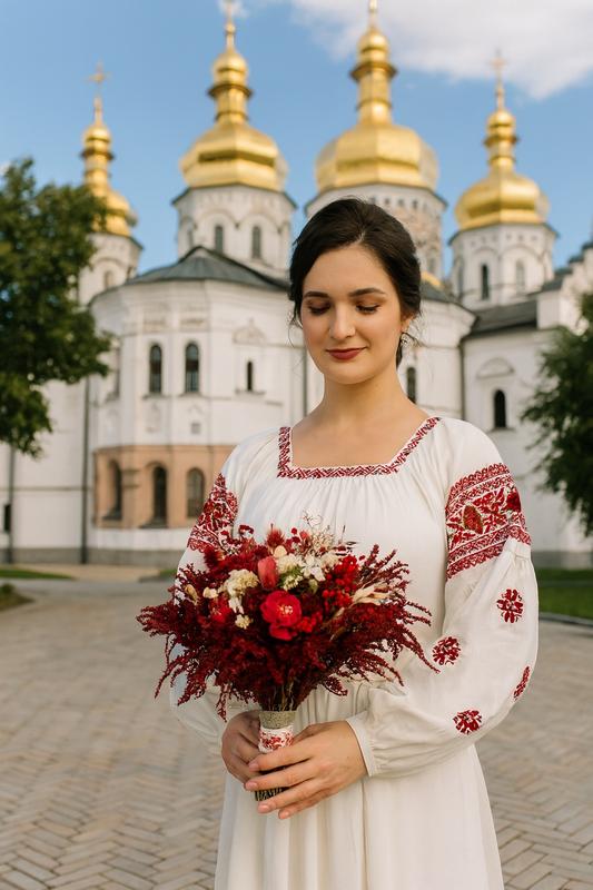 Букет із сухоцвітів у червоних та бордових тонах з елементами українського етностилю