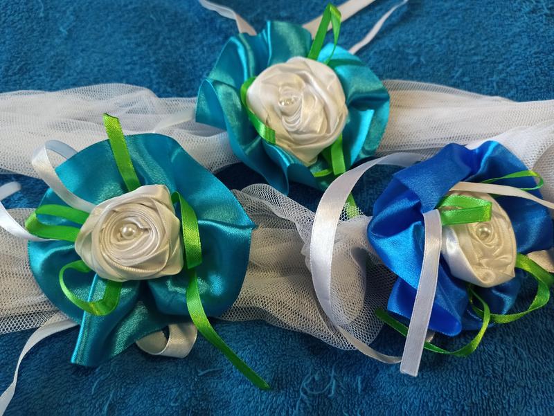 Красивенькое украшение декор для свадьбы, для праздников. На белом фатине атласные розочки, цена за две полоски. можно на свадебную машину Длина 97см тянется за счёт Фатина до 120см