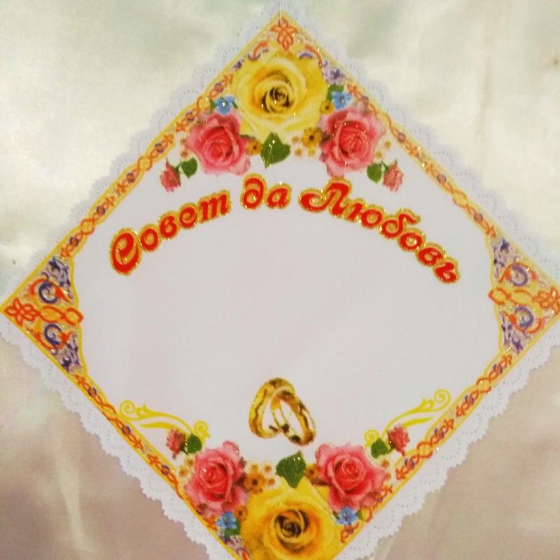 Платочки используются при венчании. С их помощью молодожёны держат свечи, а свидетели удерживают венцы. Размер: 23*23 см, материал: габардин, фигурные края, глитер. Цена за 1 штуку.