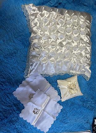 Подушка для нареченої, подушечка для кілець, весільні носові хусточки 3шт, пакети для короваю або торта 13 шт.