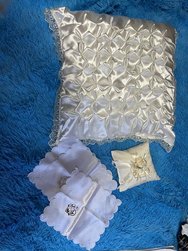 Подушка для невесты, подушечка для колец, свадебные носовые платочки 3шт, пакеты для коровая или торта 13 шт.
