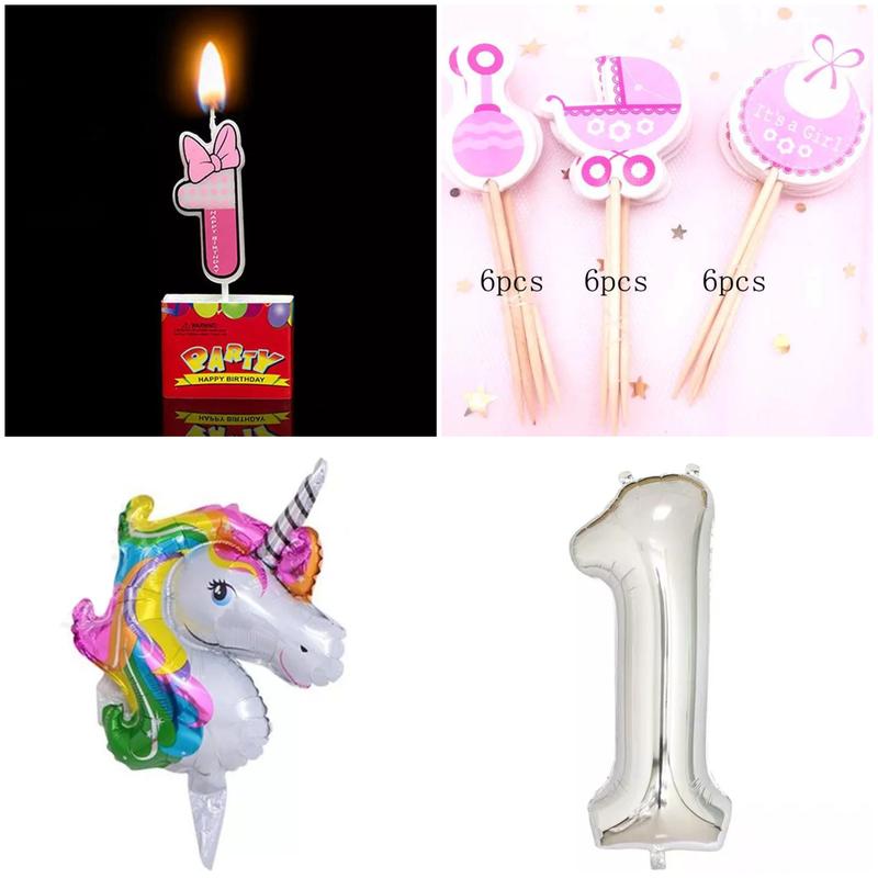 Набор для девочки: ✅ свечка с цифрой 1 - 1шт ✅ украшения для угощений- 18шт ✅ шарик "Единорог" (40см) - 1шт ✅ шарик цифра 1 (40см) - 1шт