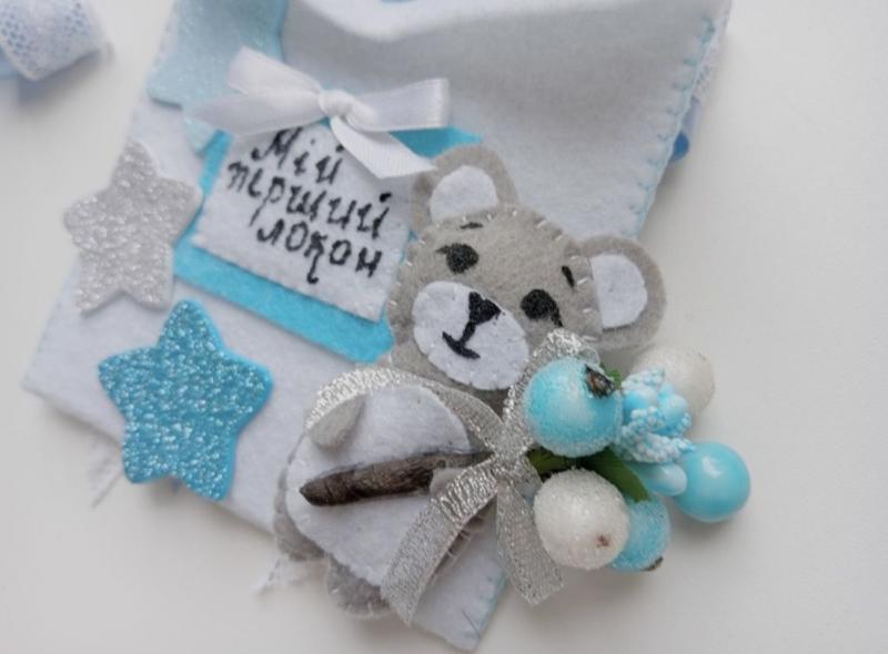 Конверт на волоссячко дитини на 1 рік. Зроблений із фетру, всередині паперова устілка, щоб волосся не борсалося. Можна зробити і в іншому дизайні з різноманітними кольорами. Ціна вказана за набір, включаючи ножиці. Можна і інші, по домовленості.