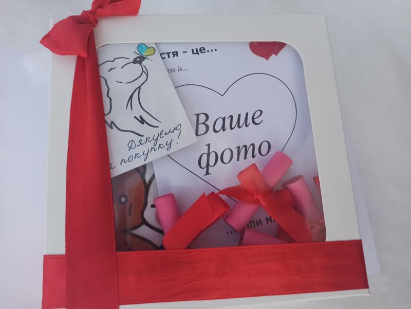 Ціна: 390 грн В набір входить: ✔️Кружка з Власним принтом (може бути з 2 сторін, ціна та ж ) ✔️Відкритка (15*15 ) з Власним побажанням чи фото ✔️50 причин чому я тебе кохаю ✔️Шоколадка з передбаченням ✔️Упаковка