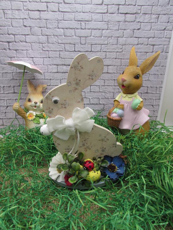 Зайчик на підставці, декорований в техніці декупаж. Підставка прикрашена декоративними квітами, травичкою, декором. Зайчик прикрашен дзвоником і пишним бантом. Такий декор прикрасить Ваш стіл на Великдень. При декоруванні були використані матеріали на водній основі не шкідливі для оточення. Матеріал: МДФ Розмір 12х18х7 см