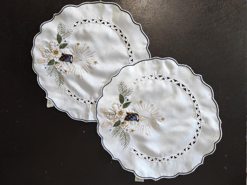 Салфетки праздничные, текстиль Sonka С вышивкой, и перфорацией Диаметр 27 см Состав: полиэстер В наличии 2 шт. Цена указана за единицу
