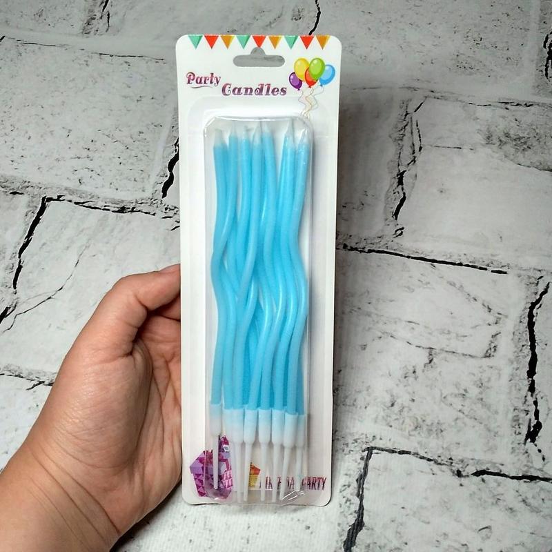 Свечи в торт длинные Завитушки. Свечи голубого цвета. Характеристики: В упаковке - 12 шт Цвет - голубой Высота - 13 см