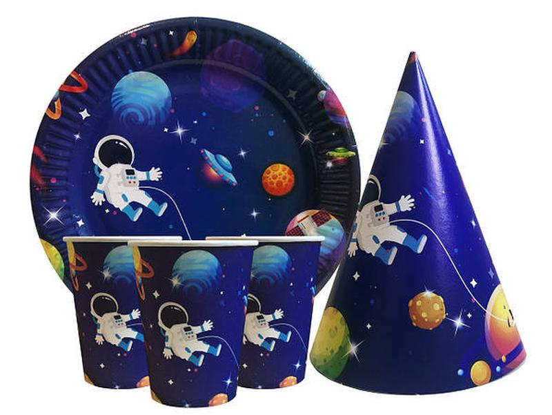 Набір святкового посуду для хлопчика космос космонавт ковпаки стакани тарілочки по 10 шт