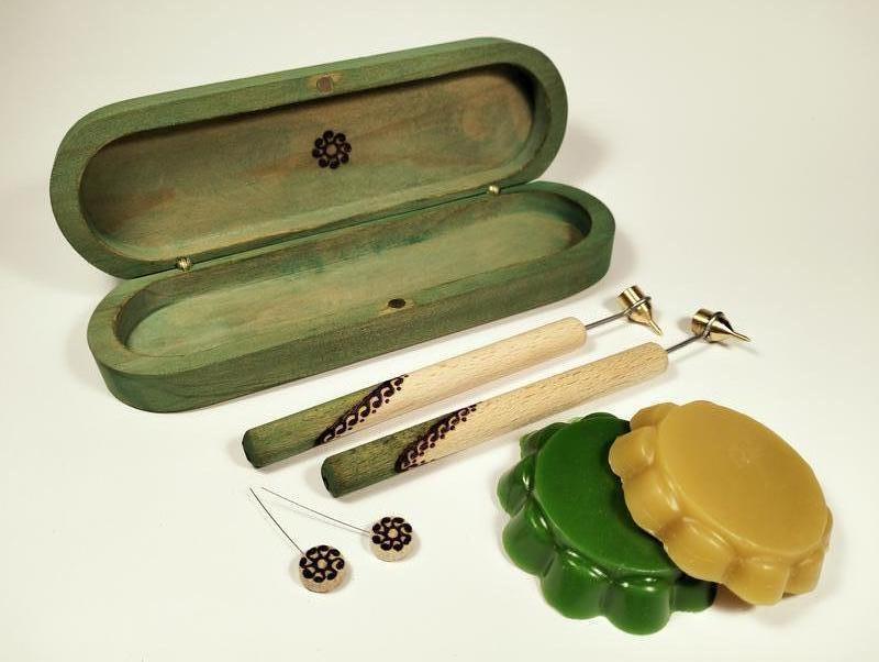 В набор входит: - деревянный пенал; - 2 пустышка разных размеров; - 2 Чистчки; - 2 кусочка натурального пчелиного воска (желтый и зеленый). Инструменты декорированы в технике обжига по дереву. Ручная работа.