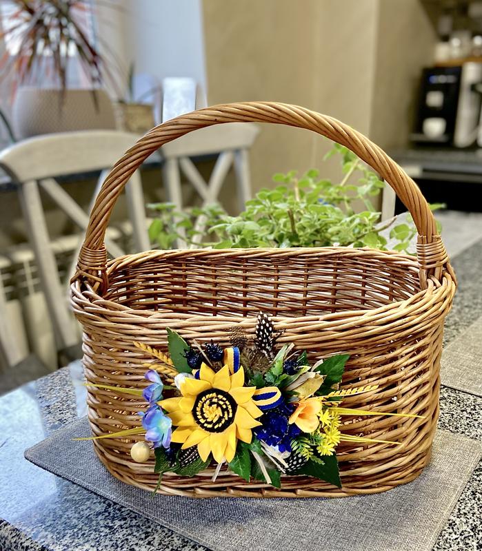 Съемный декор на крупной корзине в сине-желтых украинских цветах💙💛 Украшение выполнено таким образом, что вы можете самостоятельно ее прицепить на корзину с помощью флористической проволоки, который закреплен в декор💪 PS Возможно исполнение под размер вашей корзины с учетом ваших пожеланий Высота -20см Ширина-25см