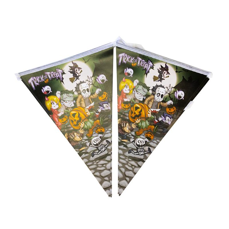 Гирлянда Хэллоуин флажки №33 - самый популярный и самый востребованный декор на Хеллоуин. Гирляндой можно украсить любую часть интерьера, и везде она будет смотреться гармонично! Классная бумажная гирлянда - склейка на Halloween. Отлично подойдет для украшения залов, пабов, ресторанов и ночных клубов на Хеллоуин.Гирлянда из флажков изготавливается методом цифровой сублимационной печати. Яркость красок и качество печати великолепно и неизменно со временем. В качестве крепления используется капроновый шнур. Такое украшение наверняка запомнится Вашим гостям и добавит ярких красок в Ваш интерьер. Оптовый поставщик №1 в Украине товаров для праздника Карнавал Приколов, предлагает широкий ассортимент декора для праздников и вечеринок.