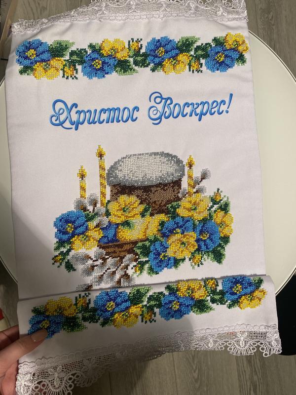 Вышитое бисером зимнее полотенце. Подшит тканью и отделан кружевом. Длина -49 см. Ширина - 31 см