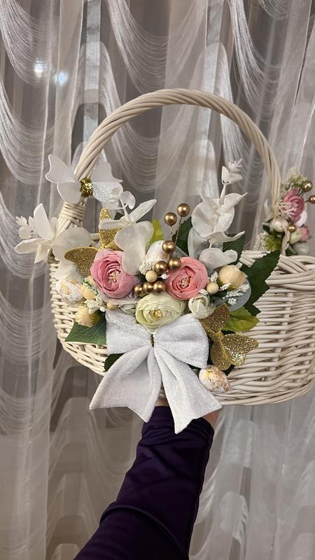 Великодній кошик з цільної вибіленої лози Найбільший кошик з асортименту Розміри : Довжина -38 см Ширина -35 см Висота-15 см Висота з ручкою-36 см . Кошики не фарбовані ❌ Можна придбати без декору , або з декором Ціна кошику без декору - 700грн Декор 300грн . Можна зробити на будь-який смак, в будь-якій кольоровій гаммі ✅✅ Сомовивіз :Біла Церква, Звягель , Ємільчине