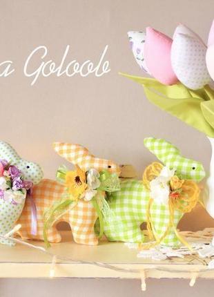 Під замовлення Вартість вказана за 1 кролика Останнім часом стало традицією поряд з пасками та писанками класти в великодній кошик й фігурки зайчиків. Їх все частіше можна зустріти на святковій великодній атрибутиці Та й як невеликі подарунки дітям разом із шоколадними яйцями подають і фігурки кроликів. Адже погодьтеся дуже приємно отримати такий милий презент у найсвітліше та найдобріше весняне свято! А у нас можна придбати кроликів на будь-який смак – яскравих та ніжних, більшого та меншого розміру, у горошок чи клітинку, а також різної форми Ви зможете замовити великодній декор з кількох персонажів в одному колірному рішенні і скласти композицію для прикраси інтер'єру або в якості подарунків вашим друзям та їхнім дітям Розмір маленького кролика -12*16 см Більшого -14*18см