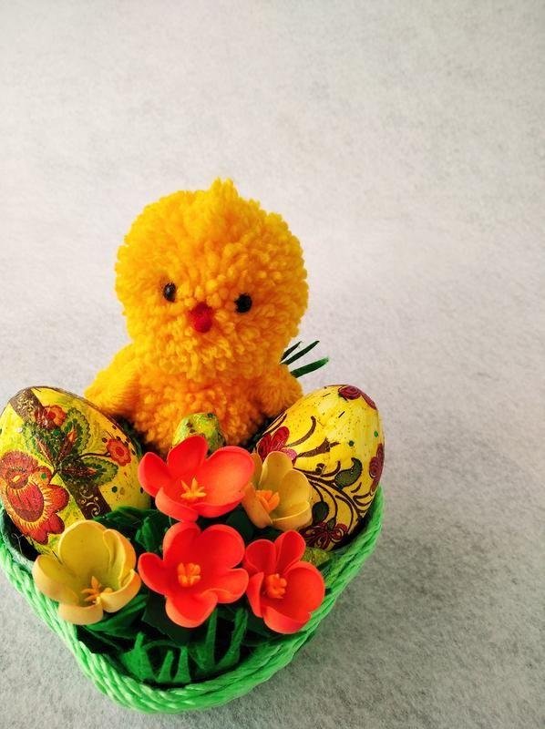 Пасхальный декор, композиция из цыпленка, цветом и окрашенных яиц, послужит прекрасным подарком к празднику как взрослым, так и детям. Основание 12*12 см., высота изделия 12 см. Цыпленок выполнен из акриловой пряжи. цветы-из фоамирана, трава-из фетра,
