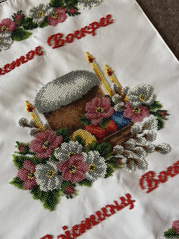Пасхальное полотенце вышит чешским бисером на габардине и украшен кружевом размер 40 х 60
