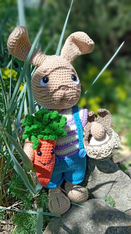 Игрушка связана крючком в технике амигуруми.Зрост 30 см.Одяг снимается.В корзине связано яичко.Кошик снимается, яичко можно вытащить.Морковая пришитая к лапе.Вудовой подарок или декор.