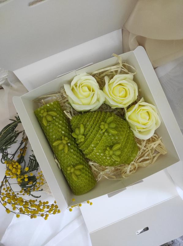 набор свечей к Пасхе натуральная вощень яичко 10х7см 13 х 3.5 см и 3 мыла в виде розы