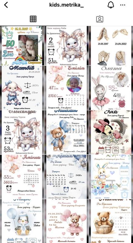 Сделаем любую метрику по Вашему желанию😍 Детская метрика отличное упоминание о самом важном, о дне рождения вашей крохи. Отлично подойдет для оформления детской комнаты, в роли подарка и сюрприза.❤️ Преимущества электронной метрики📧: 🧸Не нужно ждать, когда метрика доедет к Вам по почте 🧸 Не нужно платить за доставку 🧸 Вы можете распечатать в любом количестве и подарить своим родным и близким 🧸 Можете распечатывать на нужном для Вас бумаге (плотность, формат, размер) 🧸Вы сами выбираете рамку, которая вам больше понравится Цена любой метрики в электронном варианте - 70 грн🔥 Также изготавливаем метрики ****** Для просмотра нашего ассортимента или заказа пишите в инсталграм ************