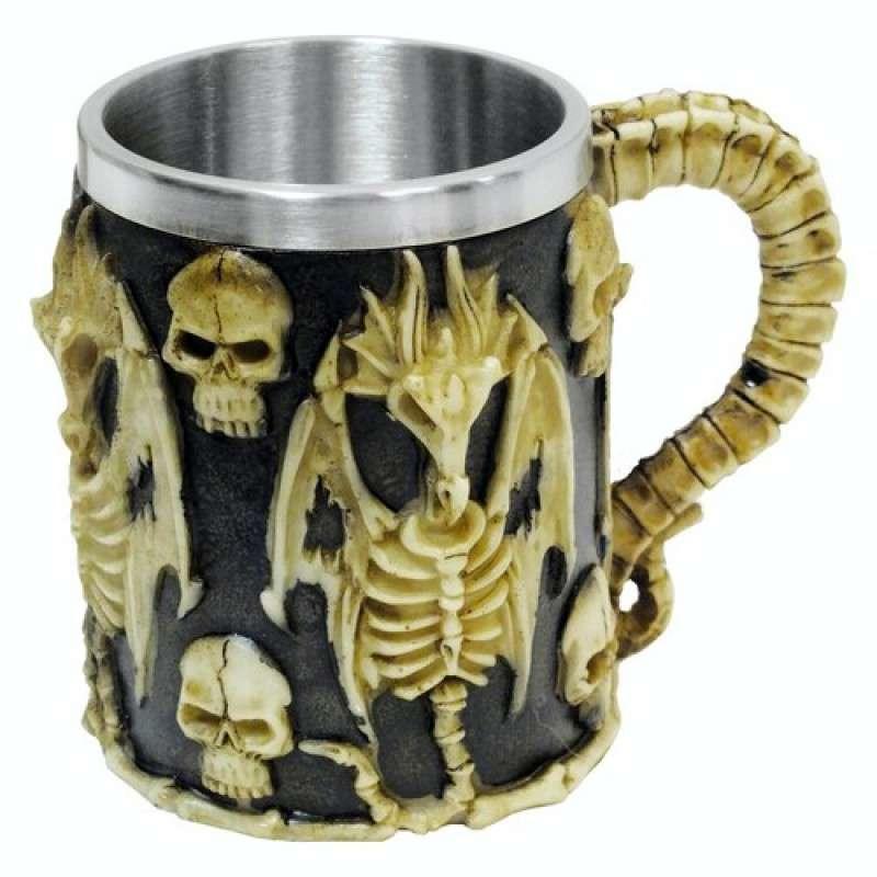 КРУЖКА Скелет Дракона 18-32 Материал: полимер, металл Цвет: бежевый, чёрный Диаметр 10см, высота 11,6см. Объём - 400 мл (не под край). Необычная чашка может послужить декором на Хэллоуин. Так как внутренняя часть и верх выполнены из нержавеющей стали, чашку можно использовать по назначению.