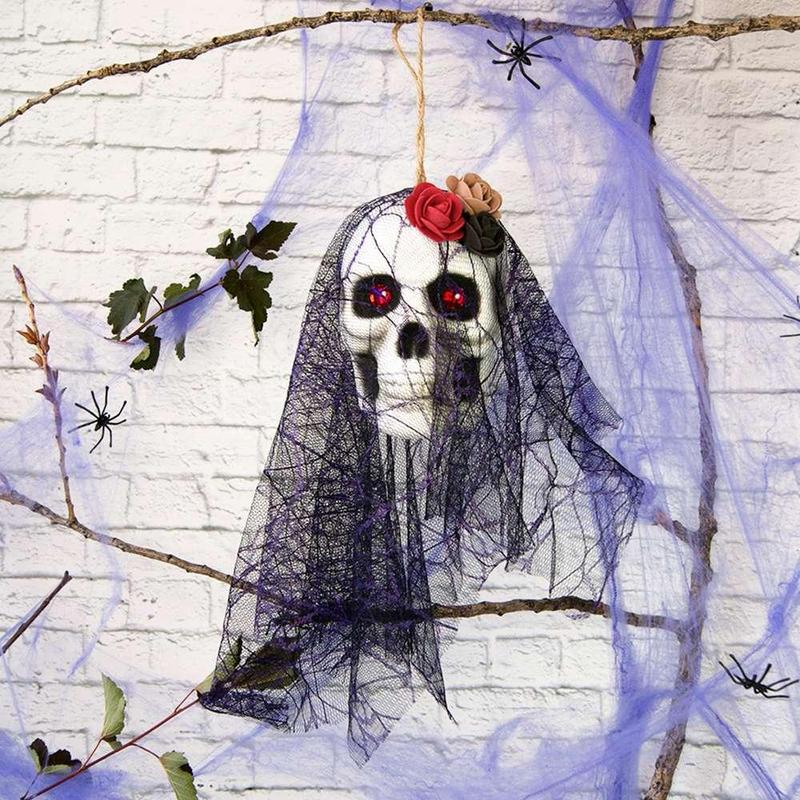 Череп готический Амиона черный с фиолетовым №10054 HL1-0054 Размеры: 40х15х10см Цвет: черный с фиолетовым Материал: гипюр, пенополистирол Череп готический Амиона черный с фиолетовым №10054 - украшение на Хэллоуин из серии подвесного декора с петелькой для подвешивания на вечеринку в стиле Santa Muerte или Хэллоуин. Череп готический с фатой изготовлен из качественного материала, который не рассыпается, пенополистирола, фата - гипюр. Особого шарма готическому черепу придают три розочки из фоамирана. А красные кристаллы в глазах эффектно переливаются и создают впечатление горящих глаз при попадании света. Идеально подходит для украшения арт-пространства клуба, фото зоны на Хэллоуин. Просто повесьте на дверь или стену, чтобы удивить ваших гостей во время праздника Дня всех мертвых. Также декор можно поставить на край стола, барной стойки и фата будет красиво свисать. Рекомендуем к этому подвесному черепу готическому еще паутину которая поможет Вам воссоздать мистическую атмосферу.