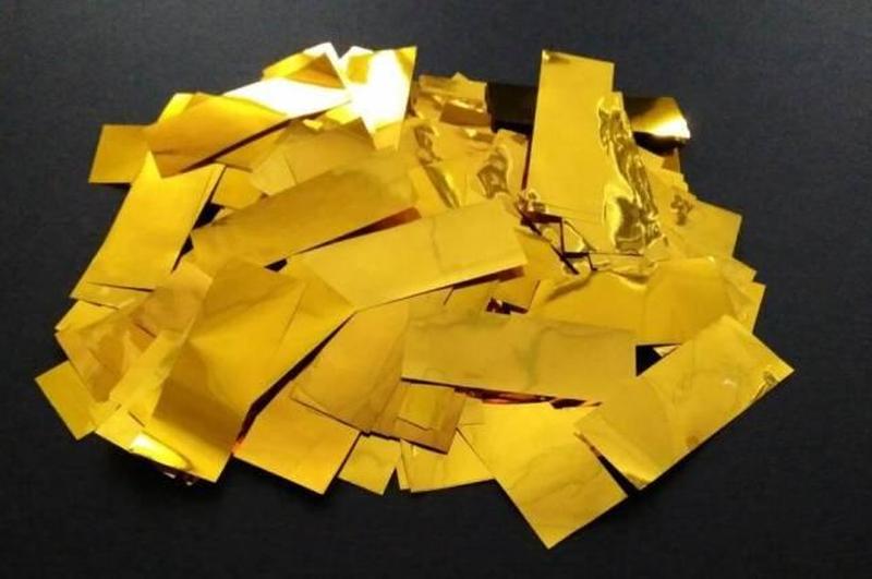 Конфеті -- метафан. Матеріал -- поліпропілен металізований, вогнетривкий, проводить струм. Розмір 15 мм х 40 мм. Дуже легкий і тонкий (30мікрон) Використовуються для різних типів заходів та свят, як елемент декору та наповнювач для куль. А також для розсипання за допомогою генераторів конфеті та хлопавок. В пачці 10 грамів!