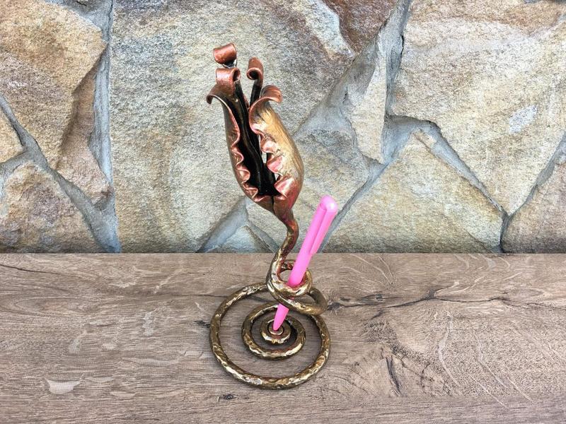 Ищете необычный и уникальный держатель для ручек? Вот он! Подставка для ручек может быть не только простой подставкой для ручек, но и настоящим шедевром, который украсит ваш дом, офис и подчеркнет особенности интерьера. Кованая вручную подставка для ручек, изготовленная в виде экзотического цветка. Размер: Высота: 24 см Ширина: 10 см Добавьте очарования своему дому с помощью одной из этих милых поделок! Хороший подарок на день рождения, годовщину свадьбы (6 (железо), 11 (сталь)), подставка для карандашей, День матери и многие другие поводы. Это универсальный подарок на многие случаи.