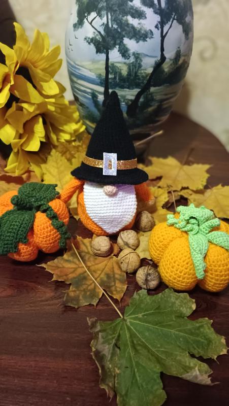 Осенний декор. Гном (органайзер-для всевозможных мелочей, конфеты, орешница), а также тыквы связаны крючком. Размеры: тыква со светло-зелеными листьями 12 см диаметр, тыква с темно зелеными листьями 10 см, гном с шляпой 23 см высотой. Можно приобрести отдельно по 180 грн. Набором 500грн.