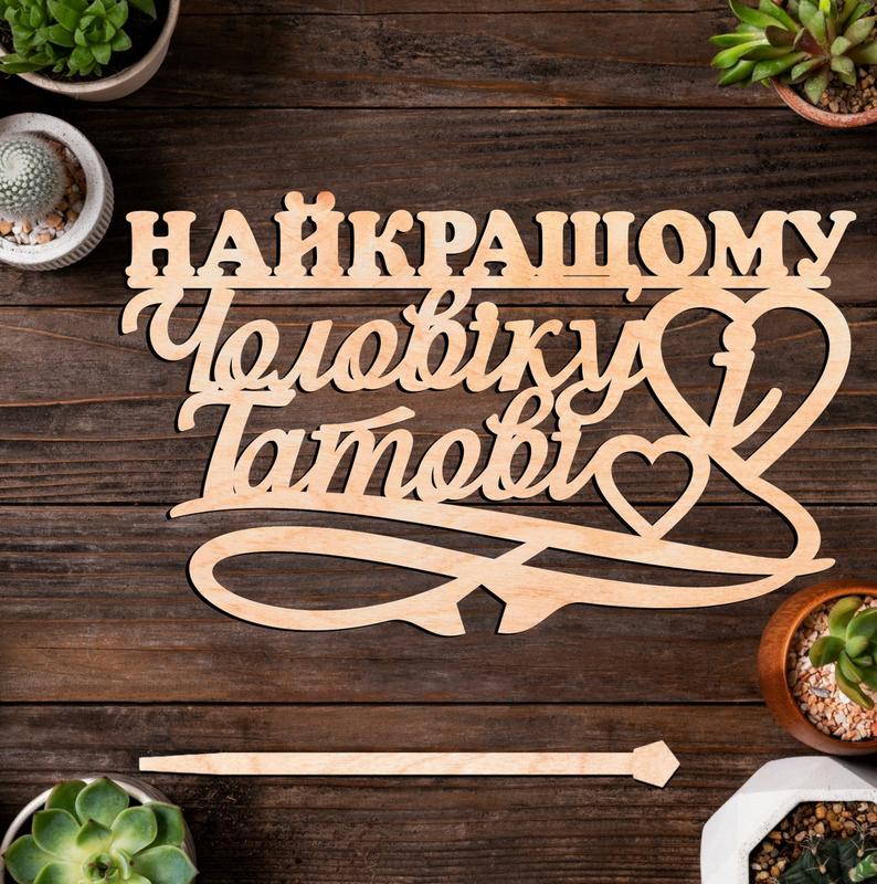 Деревянный топпер "найкращому чоловіку і татові" надпись 14х8cм для торта в букет цветы фи...