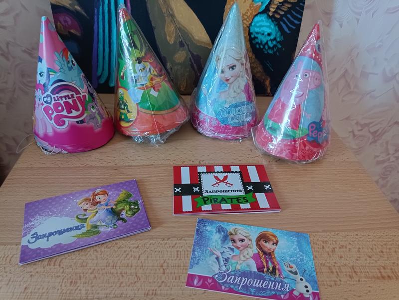 остатки праздничной атрибутики, колпаки по 10 шт, ниндзя -7 шт., приглашение : София -7, пираты-8, эльза-1