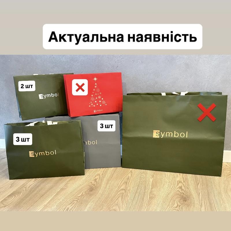 Будь ласка не оформлюйте угоду без домовленості! Продаю оригінальні пакети Symbol, бувають різні, по можливості виставляю наявні, але не завжди всгигаю, тому питайте наявні Пакети відправляю тільки тільки при повній оплаті на карту ❌Великі 600 грн (60см/47см) поки немає ✅Середні 500 грн (43см/33см) 3 сірих; 3 зелених ✅Менші 400 грн (30см/24см) 1 зелених ❌Найменші 350 грн (23см/15см) поки немає Також є: - поліетиленові зіп пакети - 100 грн за шт (є 6 шт) - папір - 100 грн за шт (поки немає) дві коробочки ❌Синя - продана ✅Червона - 16/16/4висота - 300 грн Дивіться інші мої оголошення! Є оригінальне пакування люкс брендів При оформленні через Розетку доплата за пакування 100 грн