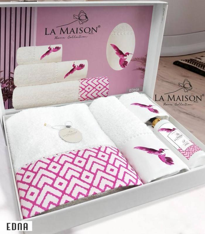 Подарунковий набір рушників La Maison з ароматом Edna • Тканина: махрова • Склад: 100% бавовна • Щільність: 500 г/м² • Розміри: • 30 × 50 см — 1 шт. • 50 × 90 см — 1 шт. • 70 × 140 см — 1 шт. • Кількість в упаковці: 3 шт. • Виробник: Туреччина • Упаковка: фірмова подарункова коробка Ідеальний вибір для стильного подарунка чи для власної спальні! Ціна: 1800 грн