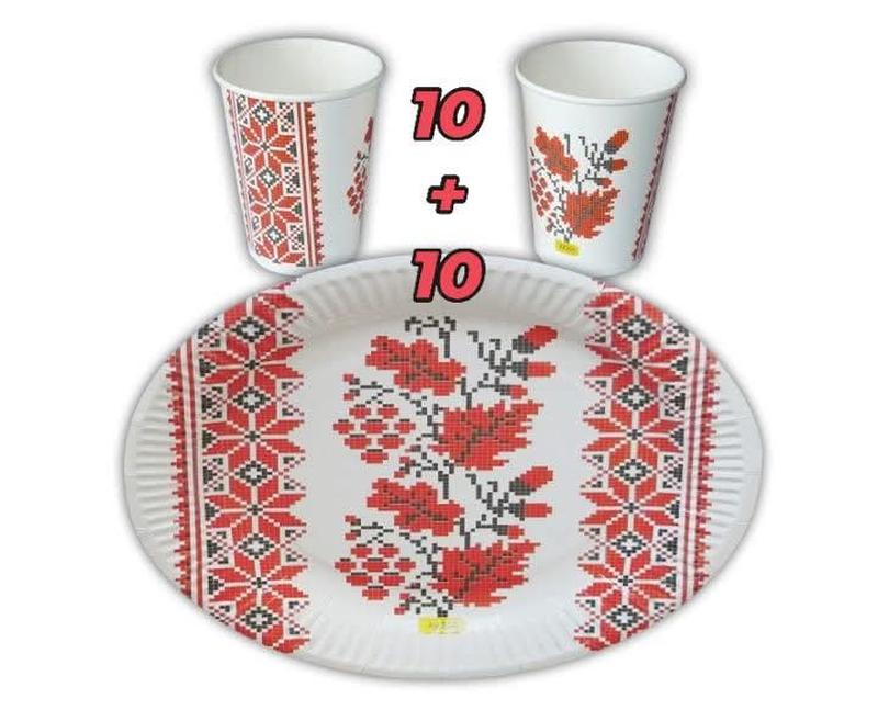 Набор праздничной одноразовой посуды принт вышиванка 10 тарелок 10 стаканов ламинированные
