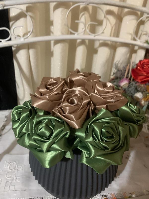 Букет роз ручной работы по ленте, стоимость 500 гривен! Цвета можно комбинировать на ваш стакан, могут быть желто-голубые или черно-красные! Ткмрим изготовления 2-4 дня!
