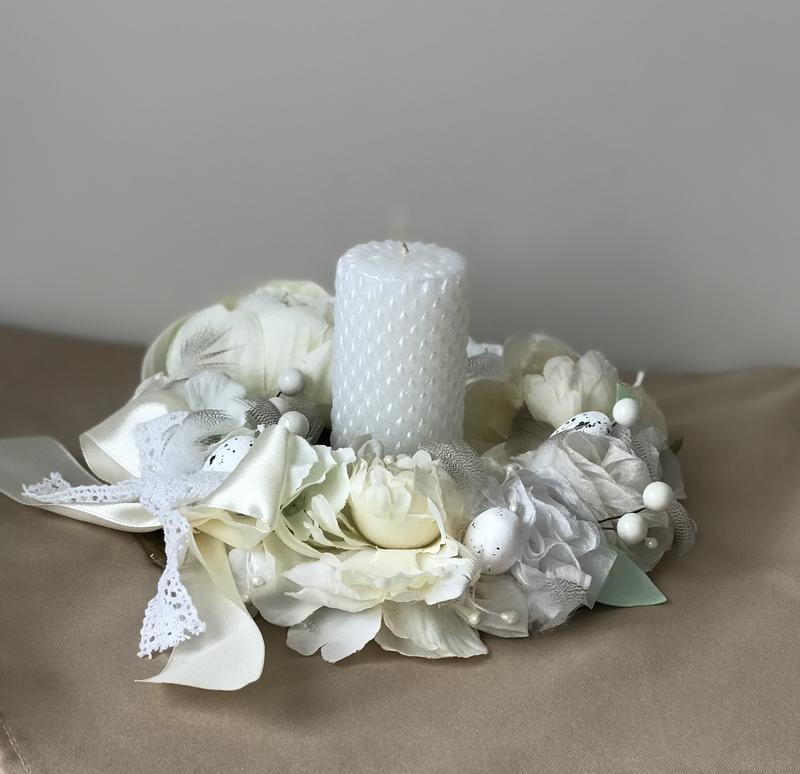 Композиция под свечу ручной работы в нежных бежевых цветах. Подойдет для декора праздничного стола, а также придаст уют для дома. Диаметр 20 см. Свеча в стоимость не входит.