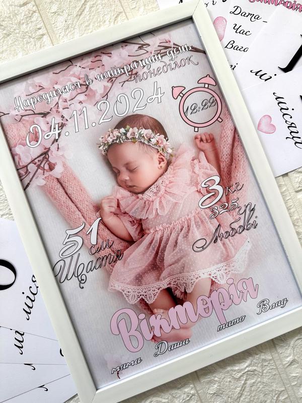Детская метрика по заказу, для мальчика, девочки. Возможно исполнение по Вашему варианту. Метрика с рамочкой, формат А4, со стеклом. Срок изготовления 1-3 дней. Карточки по месяцам 100 грн, двух посторонние. Хороший подарок для ребенка и молодых родителей.