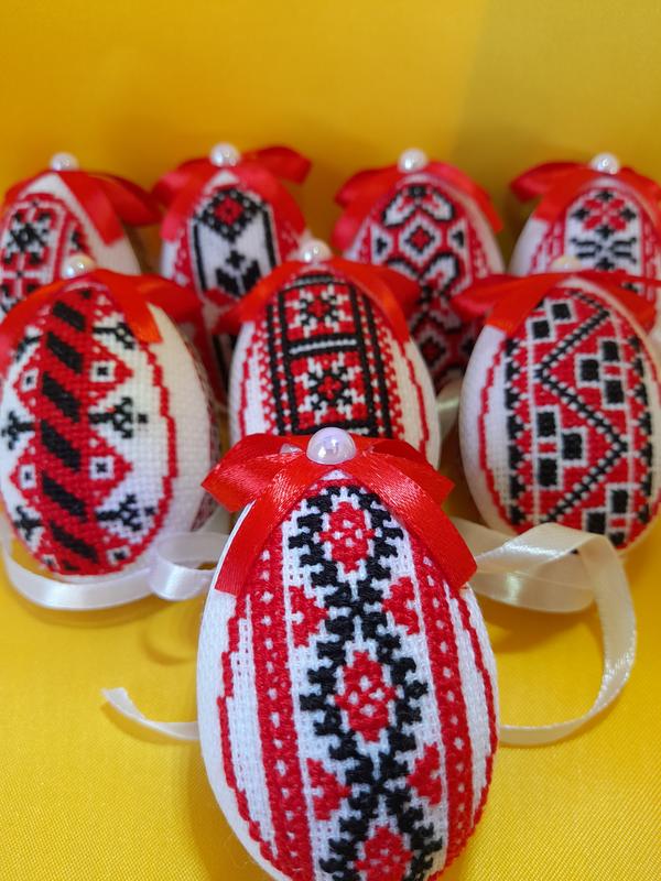 Писанки вышиты в традиционных цветах ручной работы. Высота 7см. Вышивка односторонняя, другая сторона атласная. Писанка имеет подвеску-завязку, можно завязать на праздничную корзину или крупной букет или украсить дом. Писанки в ассортименте, есть поштучно и в наборах
