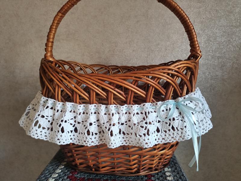 Украшение в виде кружевного волана традиционно белого цвета на атласной нежно-голубой ленте для крупной корзины. Соединяется из 100% хлопка. Уберет вашу корзину к празднику, не останется незамеченным на очистке. Станет отличным подарком. Ширина 7 см, общая длина около 140 см. Подойдет на корзину до 100 см в обхвате (на фото корзина 99 см)