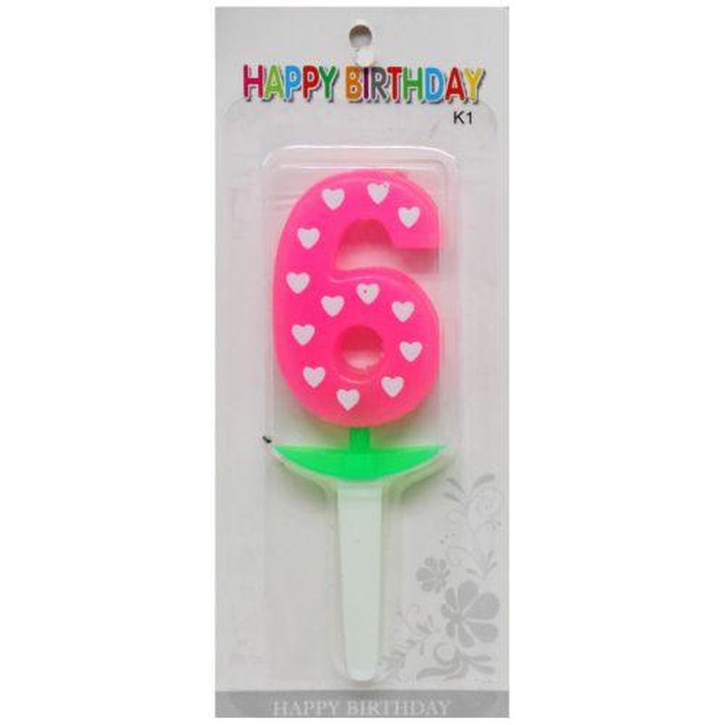 Свеча-цифра (неон) с сердечком "6", 5 см