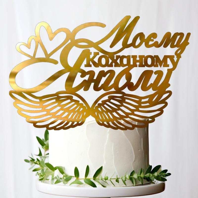 Золотой топпер "моєму коханому янголу +крила" 16х10см (без палочки) из полистирола зеркаль...