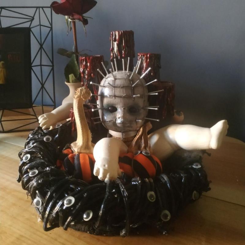 самодельный декор голова пинхэда.основа венок из лозы.есть 5 подсвечников для электрических свечей. отлично дополнит интерьер на Хэллоуин