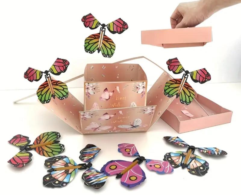 Подарункова коробка з несподіваним дизайном метеликів - ідеальна для днів народження, весіл, випускних вечірок та багато іншого - включає кілька компонентів для роздумливих презентацій, подарункова коробка | Мотив метелика | Декоративна коробка подарочная коробка с бабочками, которая, , является "взрывающейся" коробкой или "exploding box". Это тип подарочной упаковки, которая раскрывается, когда снимают крышку, открывая слои украшений, фотографий или других сюрпризов. Такие коробки часто используются для подарков на особые события, такие как дни рождения, годовщины, свадьбы или выпускные. Внутри могут быть вложены фотографии, записки, небольшие подарки или другие памятные вещи. При открытии крышки боковые стенки коробки разворачиваются. Внутри коробки могут находиться подарки, а также заводные бабочки, которые вылетают при открытии, создавая эффект неожиданности. Бабочки на коробке символизируют силу, обновление и эмоциональную поддержку.