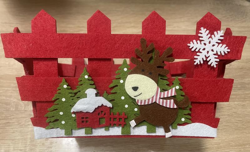 Цей декоративний кошик від Livarno Home, виготовлений з міцного фетру, стане чудовим елементом новорічного декору. Яскраво-червоний колір і прикраси у вигляді оленя, сніжинки та зимового пейзажу підсилять святковий настрій у вашому домі. Кошик ідеально підходить для зберігання маленьких новорічних сувенірів, солодощів чи подарунків. Завдяки своїм компактним розмірам (18.5x12.5x12.5 см) він не займе багато місця, але приверне увагу своїм стильним дизайном. Основні характеристики: - Матеріал: фетр - Розміри: 18.5 x 12.5 x 12.5 см - Призначення: для зберігання або декоративного використання - Особливості: новорічна тематика, ручна робота В наявності є 4 штуки. Ціна вказана за одну.