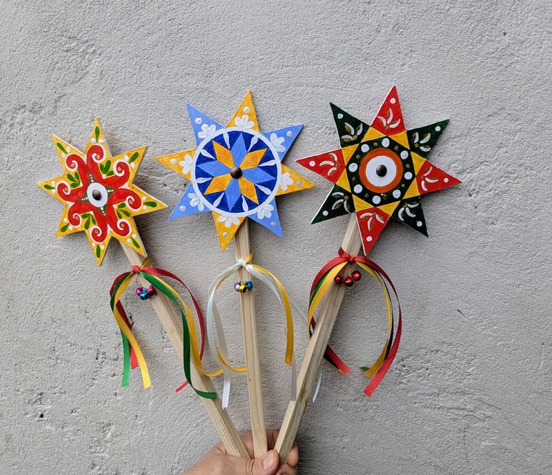 Рождественская звезда по украинской традиции украшает дом и сопровождает колядки детей или вертеп. Звездочка изготовлена из дерева, росписная акриловыми красками, украшена колокольчиками и лентами, покрыта защитным лаком на случай дождя или снега. Звезда крутится. Роспись с двух сторон. Диаметр звезды 16 см. Длина палочки 35 см, подходит именно для детской ручки.