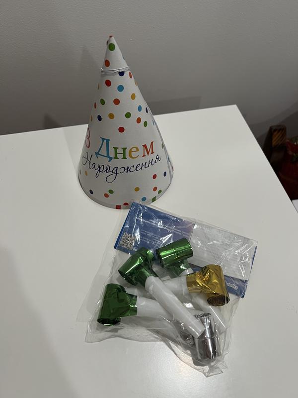 Набір для свята: ковпаки (4 шт.), свистки (5 шт.) і кульки (34 шт.)