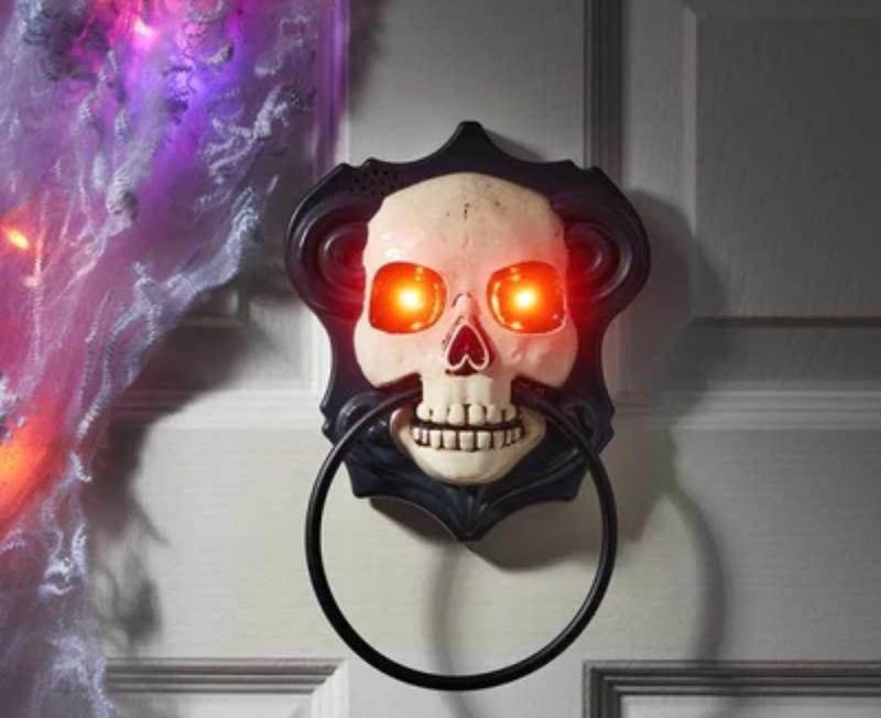 Декор на двери молоток в виде черепа придаст соответствующую атмосферу празднику Хэллоуин. Постучайте, глаза начинают светиться жутким сиянием и он издает ужасные звуки. Рекомендовано для детей от 14 лет Это украшение, декор, НЕ ИГРУШКА. В комплекте батарейки (3 ААА) и инструкция. Этот предмет следует хранить в недоступном для детей месте.